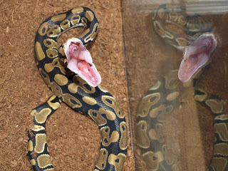 | the ball python bears its non-existant teeth |